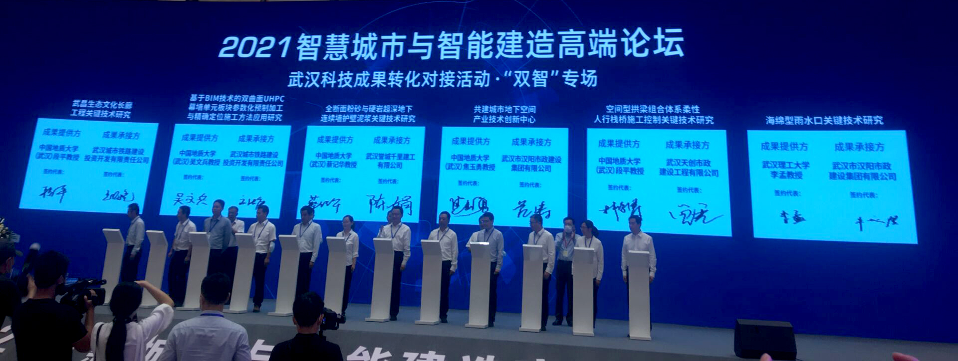(通讯员:刘浩、张美霞)9月24日,MK体育官网入口院长焦玉勇教授应邀率队出席2021智慧城市与智能建造(“双智”)高端论坛。开幕式“武汉科技成果转化对接活动 双智专场”上,焦玉勇带领我院蔡记华、吴文兵、林俊涛、刘浩4位老师分别与武汉市汉阳市政建设集团有限公司、武汉市誉城千里有限公司、武汉市城市铁路建设投资开发有限公司签订了共建技术创新中心、人才培养与科技成果转化合作协议。我院与武汉市相关部门和企业开展深度合作,将为湖北省“一主引领、两翼驱动、全域协同”的区域发展布局,和武汉建设“宜居城市、韧性城市、智慧城市、绿色城市、人文城市”的重大需求提供技术和人才支持。