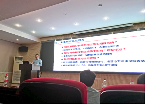 李忠超博士以“城市轨道交通工程近接施工影响研究及思考”为题,以近接运营地铁隧道施工工程频发为背景,通过超深基坑邻近地铁车站工程、大断面矩形顶管上跨既有地铁运营隧道工程和长距离共线基坑对邻近既有盾构隧道工程三个典型近接工程案例,从工程环境、地质条件、施工技术等方面对监测数据进行了深入分析,总结了近接运营地铁隧道工程的施工技术难点和既有地铁隧道结构受力变形规律,并对近接运营地铁隧道工程未来研究发展方向提出了几点思考和展望。