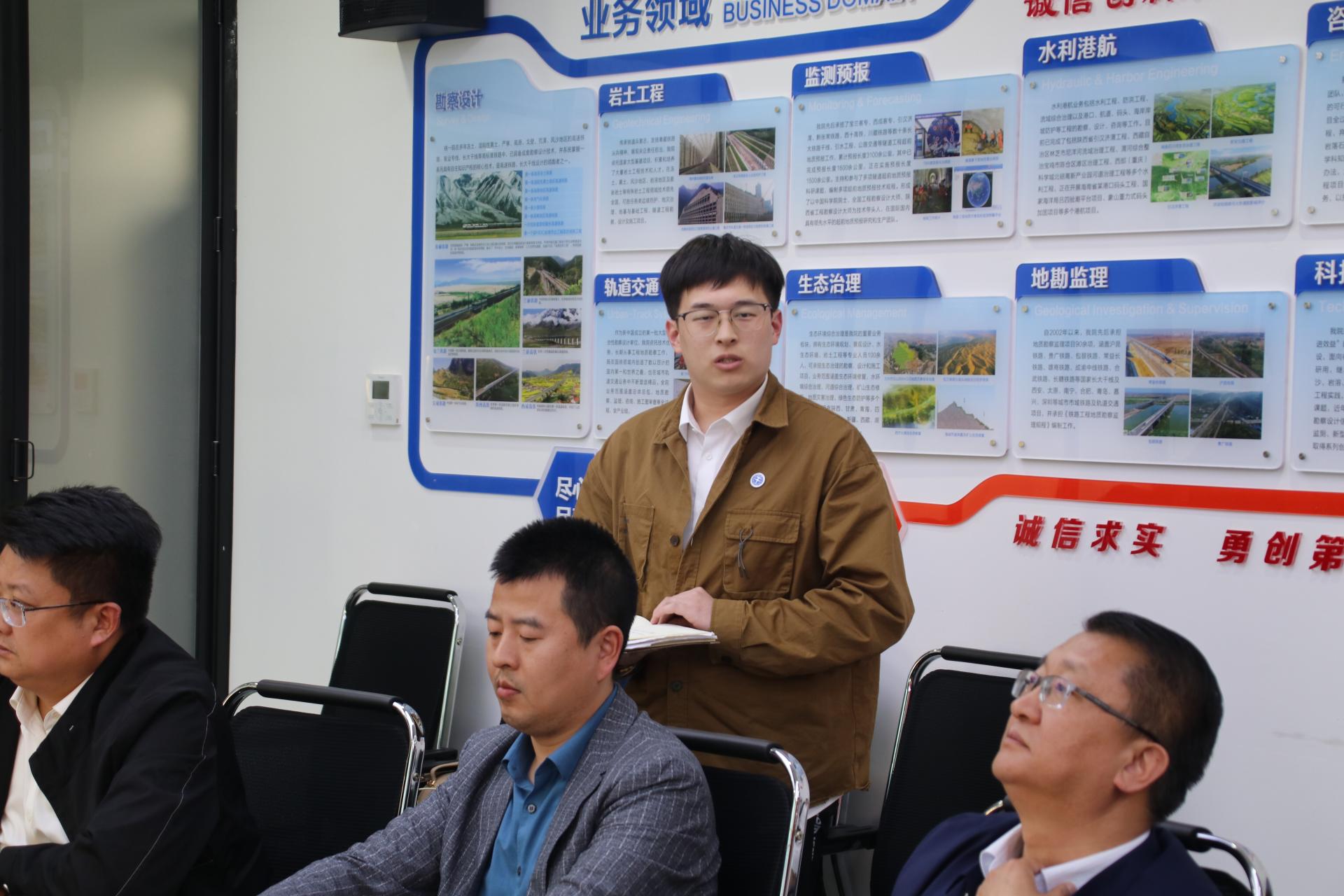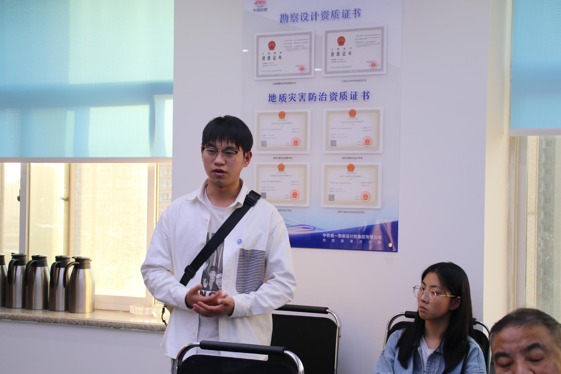 参观院史展览馆后,师生们与铁一院地质路基设计院(简称“地路院”)展开交流座谈。地路院党委书记、院长郭韫武,总工程师、副院长张文忠,副院长张志亮,副总工程师周福军,地路二所所长黄杰,综合室副主任王飞,勘探所副所长郑亮亮,团委书记罗锋参加座谈。