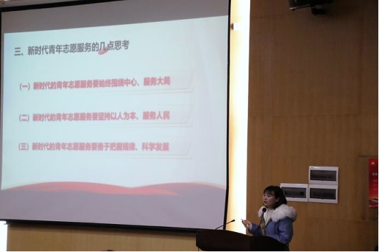 院团委副书记张怡悦作题为《党史中的青年志愿服务》报告。她指出,中国青年志愿服务缘起于中国优秀传统文化,萌芽于新民主主义革命时期,发起于社会主义革命和建设时期,在改革开放和社会主义现代化建设时期实施发展,在中国特色社会主义新时代不断改革创新,在长期的志愿服务工作中,孕育出广博而强大的志愿服务精神,已经成为国家、社会和人民值得信赖的社会公益力量。她倡议,全体工程学子都应把握“国之大者”,融入“中心大局”,聚焦实现中华民族伟大复兴的战略全局和世界百年未有之大变局“两个大局”,修好内功、学好专业,志愿服务、成才报国。