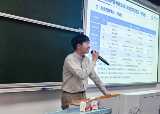 2024级辅导员彭友元介绍《中国地质大学(武汉)MK体育官网入口“优良学风示范班”创建评选办法》。他从“优良学风示范班”总体要求、创建流程、考核指标、奖惩办法等四个方面进行介绍,重点解读了班级政治理论学习、遵纪守法与文明修养、集体观念、班级制度建设、班级干部表现等5项班级综合表现指标,课堂出勤、早操出勤、课堂表现、作业完成情况、自习组织情况等5项班级日常学风指标,平均学分绩点、优秀率、及格率和英语四级通过率等4项班级课程成绩指标,以及学生参加科技创新活动等附加分项目指标。他要求同学们仔细阅读创建办法文件,对照量化评估考核指标,积极开展富有班级特色的学风建设活动。
